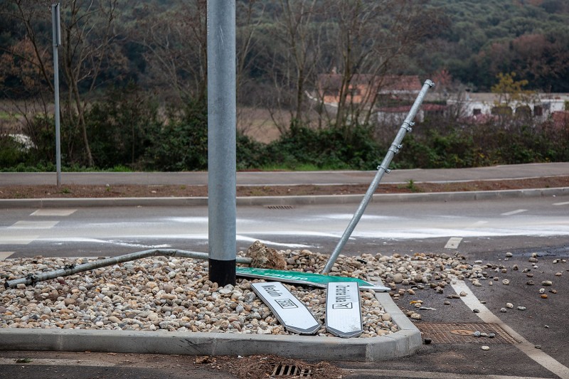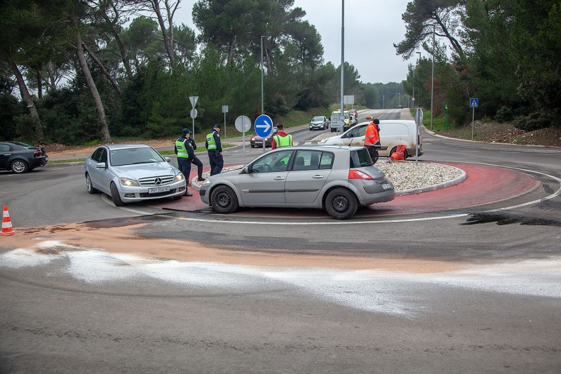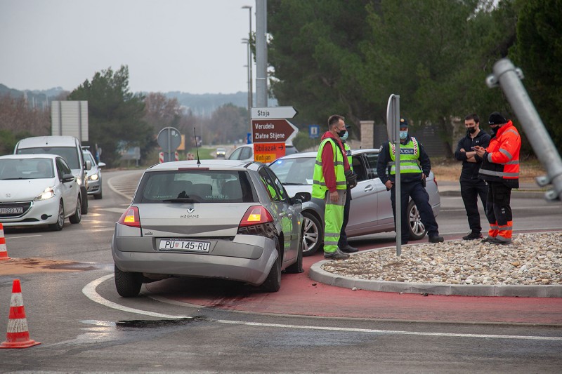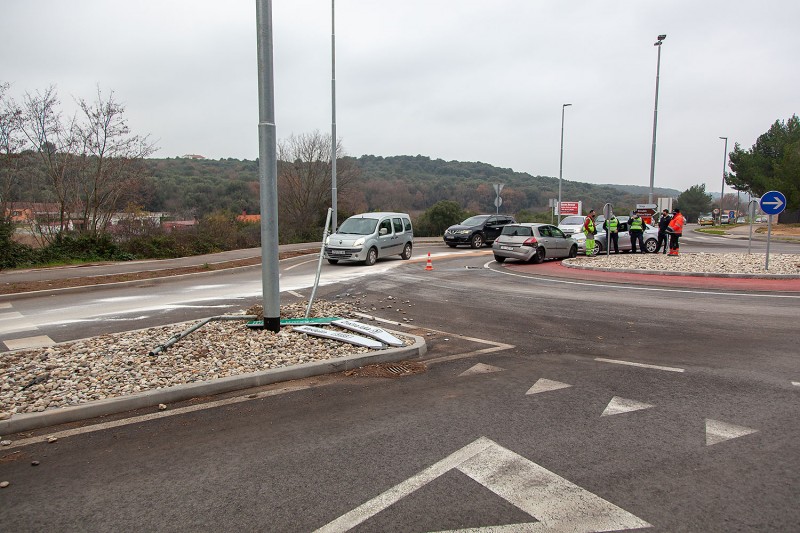 Osobno vozilo Renault Mégane pulske registarske oznake, izletio dolazeći iz smjera obilaznice, gdje je preko otoka pokosio prometne znakove i završio u suprotnom smjeru kružnog toka.