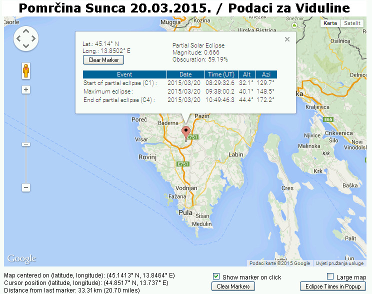 * Podatke koje smo gore u tekstu naveli o početku, maksimumu i kraju djelomične pomrčine Sunca izračunate su za Viduline (centralna Istra). Drugdje u našem neposrednom okružju vremena će se ponešto razlikovati i to za red veličine od nekoliko minuta. Pomrčina će na zapadu započeti nešto prije a na istoku nešto kasnije. Želite li saznati točne podatke o tijeku pomrčine za vašu lokaciju posjetite NASAinu stranicu;
