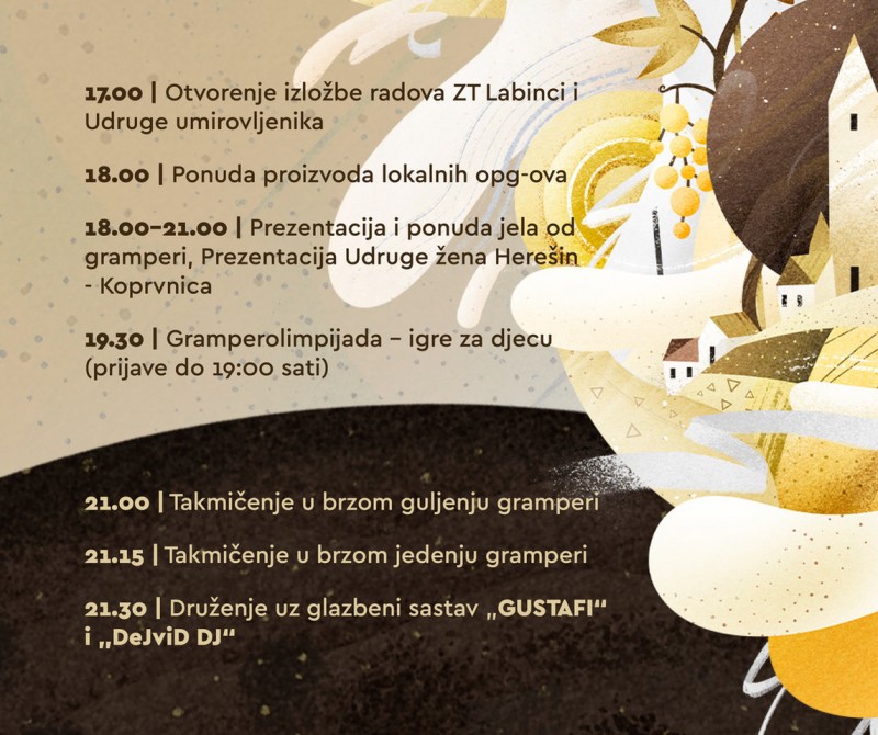 U međuvremenu će u 19:30 sati biti upriličena izvrsna zabava za najmlađe – igre za djecu naziva Gramperolimpijada (prijave za sudjelovanje primaju se do 19 sati). No zabavi tu nije kraj jer slijedi ona za sve generacije, uz koju ćete moći navijati, a sigurno se i dobro nasmijati. Jer u 21 sat počinje natjecanje u brzom guljenju gramperi, a u 21:15 sati natjecanje u brzom jedenju gramperi. U oba će natjecatelji morati pokazati zavidne vještine i kapacitete koji će biti odlična uvertira za finale fešte koje slijedi u 21.30 sati. Družit ćemo se tada uz nastup poznatog benda "Gustafi" čija glazba jamči izvrsnu zabavu i mnogo plesa, a cijelu priču upotpunit će i DJ DeJviD.