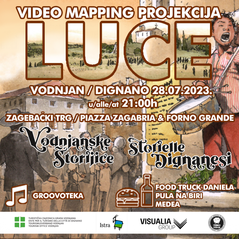 Glavni dio projekta LUCE održat će se na Zagrebačkom trgu u Vodnjanu. U suradnji s čarobnjacima svjetla iz tvrtke Visualia napravljen je novi zadivljujući video mapping čije će se projekcije održavati u intervalima od 21 h do ponoći, a posjetitelji će moći pogledati i prošlogodišnji mapping posvećen prvim Vodnjanskim štorijicama.