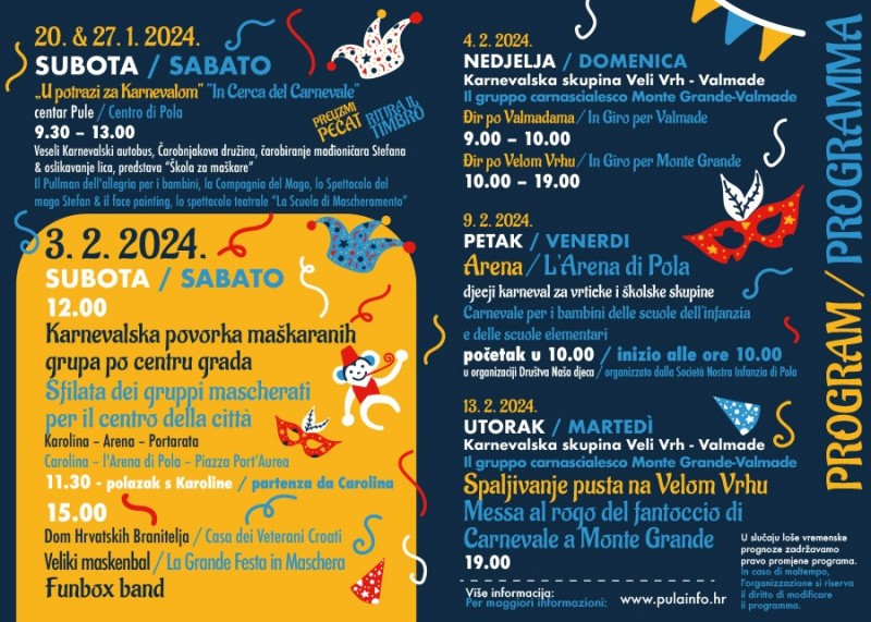 Za sudjelovanje u karnevalskoj povorci pozivamo sve zainteresirane maškarane skupine da se mogu još uvijek prijaviti, najkasnije do 25. siječnja putem e-maila: info@pulainfo.hr