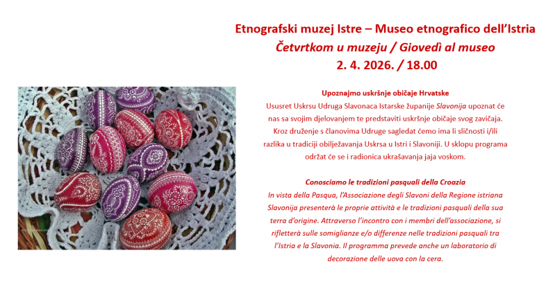 Ususret Uskrsu Udruga Slavonaca Istarske županije Slavonija upoznat će nas sa svojim djelovanjem te predstaviti uskršnje običaje svog zavičaja. Kroz druženje s članovima Udruge sagledat ćemo ima li sličnosti i/ili razlika u tradiciji obilježavanja Uskrsa u Istri i Slavoniji. U sklopu programa održat će se i radionica ukrašavanja jaja voskom.