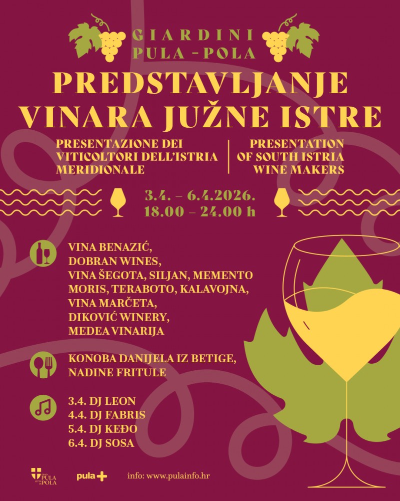 Tijekom uskrsnog vikenda, od petka 3. travnja do ponedjeljka 6. travnja, Giardini u Puli postaju središnje mjesto vrhunske vinske i gastronomske ponude. Manifestacija "Predstavljanje vinara južne Istre" održavat će se svakodnevno od 18 do 24 sata.