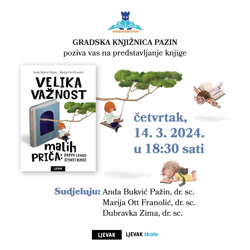U četvrtak 14. ožujka u 18:30 predstavljaju knjigu "Velika važnost malih priča". Uz autorice, Andu Bukvić Pažin i Mariju Ott Franolić, o knjizi će govoriti Dubravka Zima.