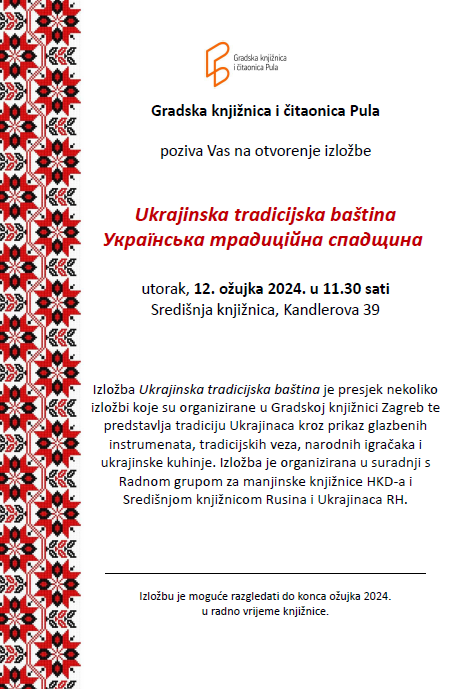 U izložbenom prostoru Gradske knjižnice i čitaonice Pula 12. ožujka 2024. u 11.30 sati svečano će biti otvorena izložba Ukrajinska tradicijska baština / Українська традиційна спадщина koja je pripremljena u sklopu programa Radne grupe za manjinske knjižnice Hrvatskog knjižničarskog društva.