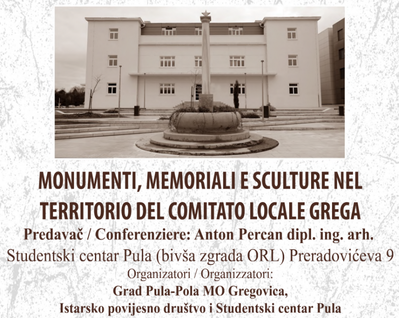 U petak, 31. ožujka 2023., s početkom u 19 sati u prostorijama Studentskog centra Pula (bivša zgrada ORL, Preradovićeva 9) održat će se predavanje Antona Percana, dipl. ing. arh., „Spomenici, spomen obilježja i skulpture na području MO Gregovica“. Organizatori su Grad Pula-Pola, Mjesni odbor Gregovica, Istarsko povijesno društvo i Studentski centar Pula.