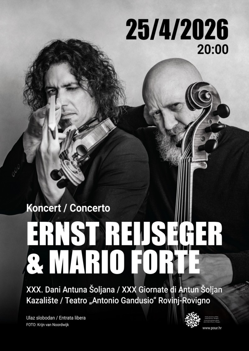 U 20 sati u Kazalištu “Antonio Gandusio” na programu je koncert dua Ernsta Reijsegera (violončelo) i Marija Fortea (violina). Svjetski poznati glazbenici istražuju glazbene žanrove od baroka do američkog jazza, a njihova suradnja započela je zahvaljujući Johnu Zornu.