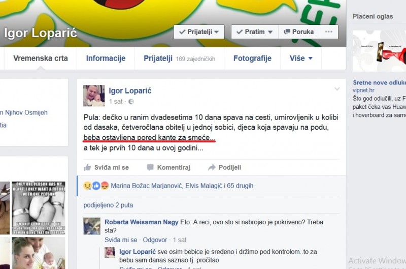 Na Facebook profilu voditelja humanitarne udruge „Naš san njihov osmijeh“ Igora Loparića večeras se pojavila informacija kako je tijekom dana u Puli,točnije na Stoji pored „kante za smeće“ pronađena promrzla beba zamotana u deku.