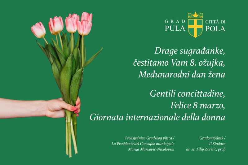 8. MART U povodu 8. ožujka, Međunarodnog dana žena gradonačelnik Filip Zoričić i predsjednica Gradskog vijeća Grada Pula - Pola Marija Marković-Nikolovski uputili su svim sugrađankama prigodnu čestitku.