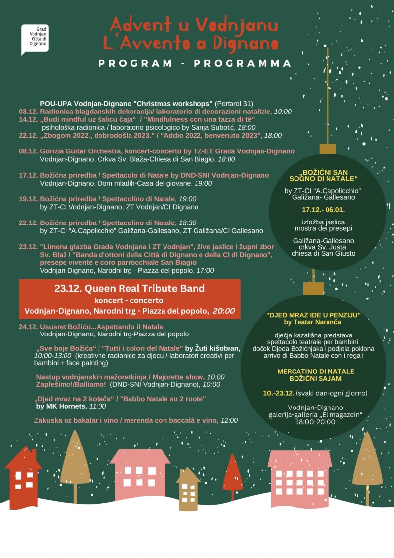 Vrhunac zabave sačuvan je za 23. prosinca 2022., kad u Vodnjan stiže pravi rock spektakl, QUEEN Real Tribute Band, koji će pred publiku na Narodnom trgu donijeti najveće hitove legendarne britanske rock grupe. Profesionalni glazbenici iz Beograda i veliki zaljubljenici u Queen okupili su se 2006. godine, te su od tada njihove bezvremenske hitove izvodili diljem svijeta. Osim po izvrsnoj svirci, poznati su i po upečatljivim nastupima te kostimima, baš poput onih kakve su nosili i sami Queenovci. Tako će koncert na Narodnom trgu biti prava poslastica i za uši i za oči, za sve ljubitelje rock glazbe i scenskog spektakla.