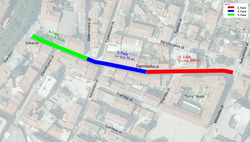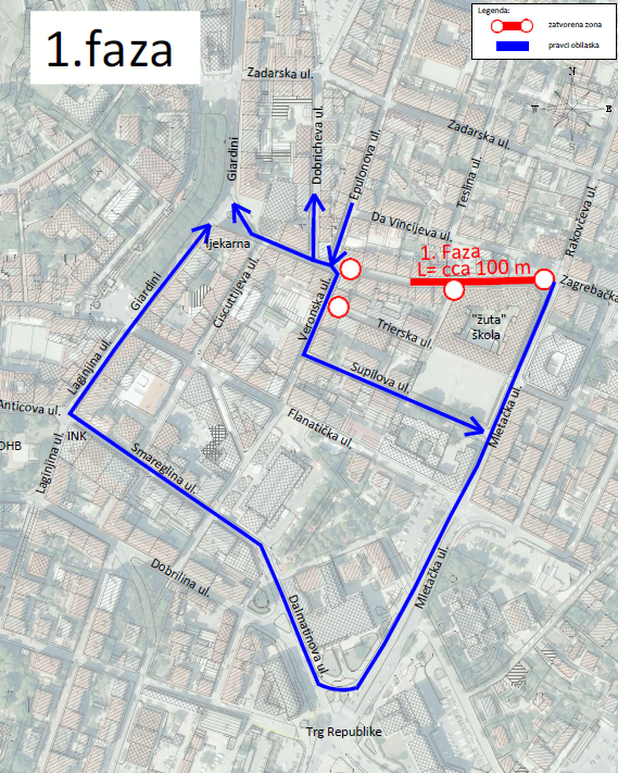 U prvoj fazi koja će trajati od 5.-12.11.2025. predviđeno je zatvaranje predmetne dionice, osim za vozila gradilišta, od križanja sa Rakovčevom ul. do križanja s Veronskom ulicom. Obilazni pravac osiguran je preko Mletačke ul., Dalmatinove ul.,Laginjine Ul. i Giardini. Obilazni pravac za Dobrichevu ul., Veronsku ul. i Supilovu ul. je preko Zadarske ul. i Epulonove ulice. Za vrijeme prve faze radova Trierska ul. je zatvorena za sav promet.