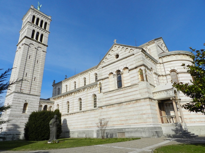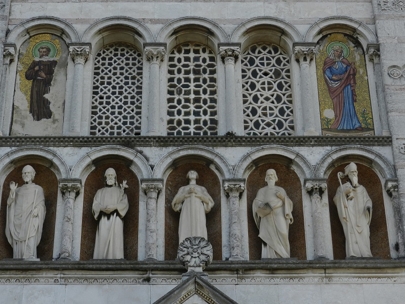 Crkva je građena u neororomaničko – bizantskom nadahnuću, u tlorisu latinskoga križa, s polukružnim apsidalnim završetkom, od bijelog brionskog kamena i rumenog mramora iz Oprtlja i Brtonigle. Dugačka je 30,50 m, široka 19,19 m, visoka oko 16 m, zvonik visok 30 m, s 5 zvona, 1989. uvedeno je automatsko zvonjenje, a na vrhu je brončani anđeo okrenut moru, kojeg je oblikovao prof. Raffaetta iz Trenta. Iznad glavnog portala zauzlanih stupova nalaze se kipovi svetaca: s lijeva Sveti Polikarpo (kipar Lewandowsky), Josip (Gruber), Barbara (kiparica T. Ries), Andrea (Leisek) i Nikola (Grunhut), pristigli 1903. iz Češke, a u gornjem redu su mozaici Sv. Franje i Sv. Elisabete. Veliki mozaik u unutrašnjosti zdanja predstavlja Posljednji sud, a otkriven je 1913.godine. Na zidu lijeve bočne lađe, blizu glavnog ulaza kameni okvir podsjeća na spomen ploču Franji Josipu I., a par koraka dalje nalazi se uklesani spomen na članove posade fregate S.M.S. Radetzky, što je stradala 1869. godine.