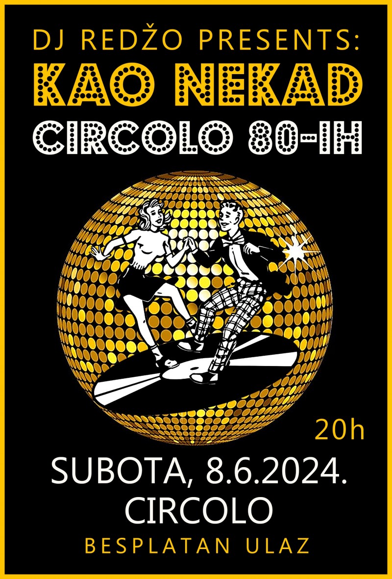 Dođite, zabavite se, popričajte s društvom koje dugo niste vidjeli i vratite se barem na trenutak u mladost i vrijeme 80-ih u Circolu. Tamo će vas za pultom čekati DJ Redžo koji je radio kao DJ u Circolu i tamo proveo najljepše trenutke. Ulaz je besplatan.