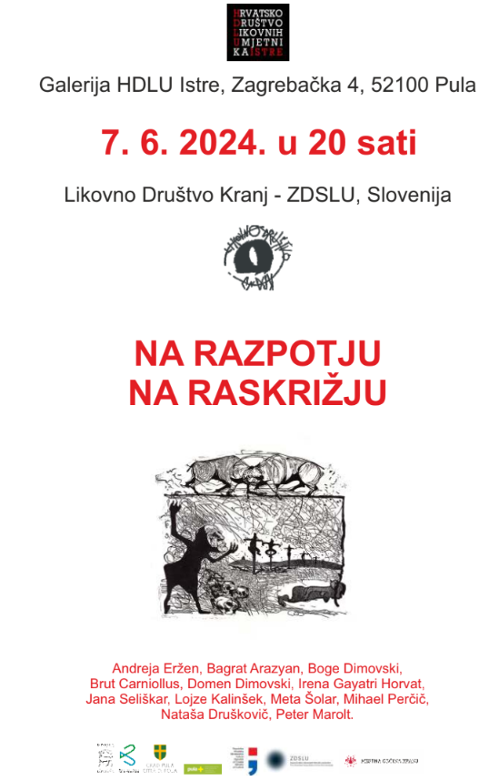 S iznimnim zadovoljstvom pozivamo vas na otvorenje izložbe pod nazivom "NA RAZPOTJU/ NA RASKRIŽJU" koja će se održati u petak, 7. lipnja su 20 sati u galeriji HDLU-a Istre. Riječ je o gostovanju slovenskih autora članova Likovnog društva Kranju u sklopu projekta HDLU-a Istre "Međunarodna suradnja sa Slovenijom". Izložba ostaje otvorena do 28. lipnja 2024.