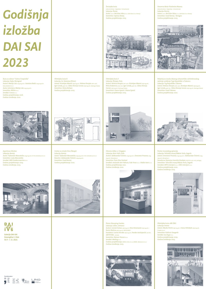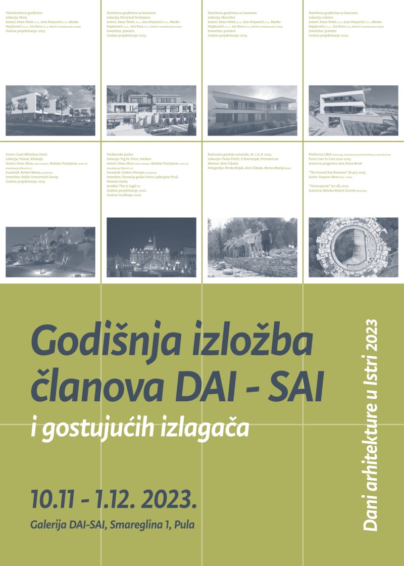 U sklopu tradicionalne manifestacije Dani arhitekture u Istri i ove će godine članovi Društva arhitekata Istre te gostujući autori izložiti svoje projekte i realizacije nastale tijekom prošle i tekuće godine. Izlažu: Jasmina Bašić, Karin Blažina, Aleksandar Ćelović, Berislav Iskra, Edna Strenja Jurcan, Marko Hajdarević, Dino Krizmanić, Igor Levak, Matija Luk, Kristijan Mamić, Vjekoslav Moscatello, Marko Perčić, Ivana Debeljuh, Dean Peteh, Zvonimir Prusina, Božidar Pustijanac, Iris Roce, Petra Rukavina, Dean Skira, Lina Stepančić, Helena Sterpin te Leonid Zuban.
