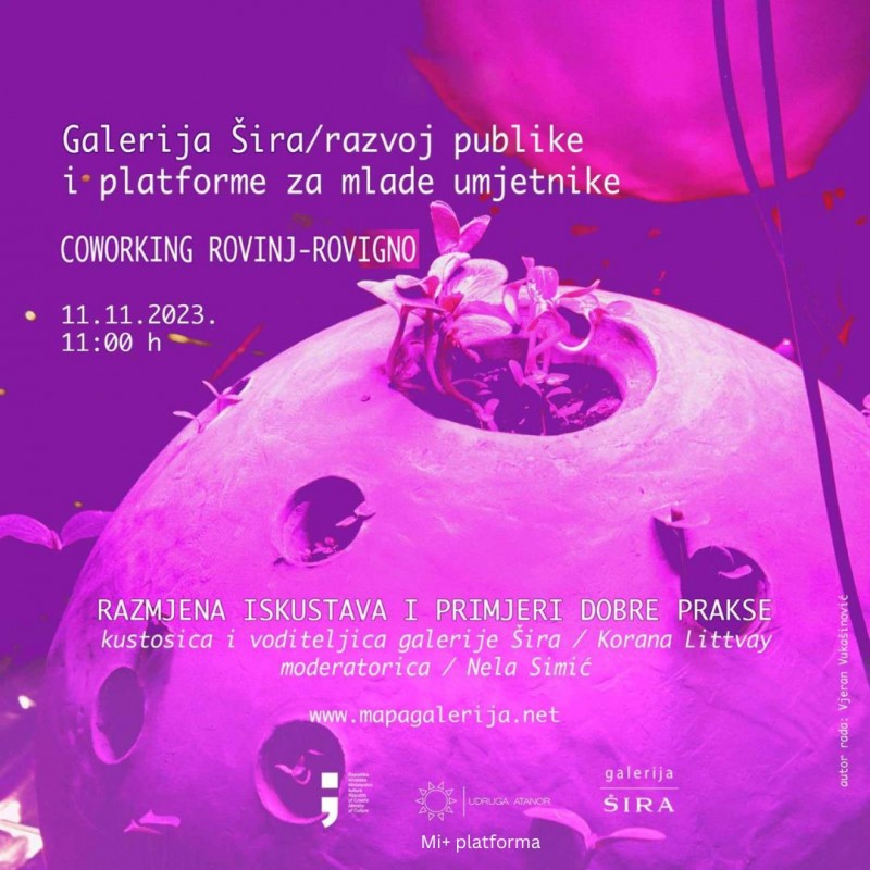 U prostoru Coworking Rovinj-Rovigno u subotu, 11. studenog u 11 sati održat će se razgovor o razvoju publike i razmjena iskustava o radu s mladim umjetnicima. Primjer dobre prakse Galerije Šira, prve galerije Akademije likovnih umjetnosti Sveučilišta u Zagrebu, predstavit će Korana Littvay, voditeljica galerije i fundusa umjetnina ALU u razgovoru s povjesničarkom umjetnosti Anjom Tomljenović.