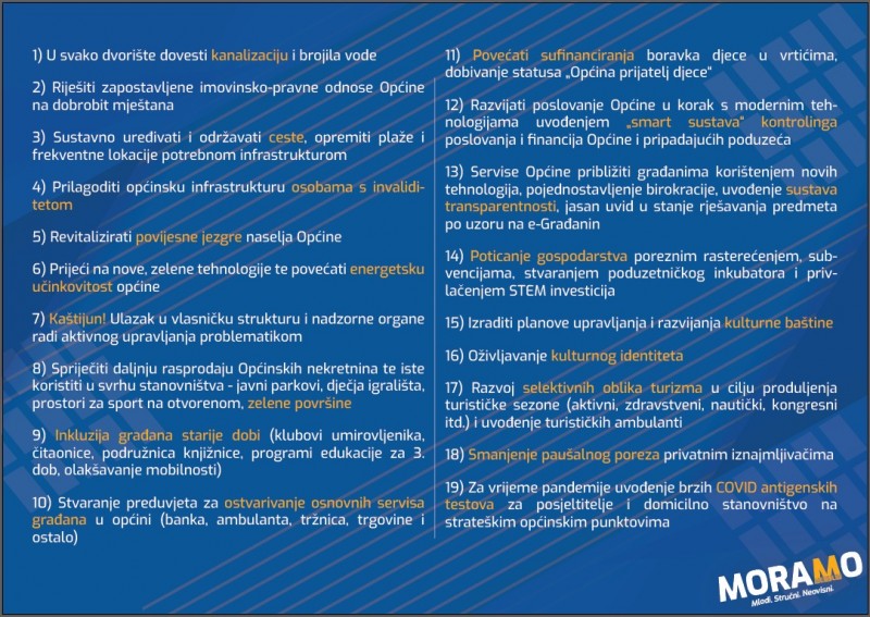 Iako im slogan ispod sve popularnijeg usklika „#MORAMO“ glasi: „Mladi. Stručni. Neovisni“, nemojte olako pomisliti kako se radi o neiskusnim ili premladim aktivistima. Upravo suprotno, na listi se nalaze 13 iskusnih ljudi koji su se već dokazali u poslovnom i akademskom svijetu te u politiku ne ulaze radi samoostvarenja, već su spremni najplodnije godine posvetiti mandatu u Općini. Upoznali smo ih do sada preko satiričnih videa na mrežama kojima na jednostavan način pokušavaju ljudima ukazati na ipak ozbiljnije probleme koji se polako počinju uvlačiti u svakodnevicu mještana. Uz obrtnike, profesore i magistre raznih struka, na listi ima kako mlađeg tako i zrelijeg kadra jer je, smatraju, uvid u život mještana svih demografskih skupina podjednako bitan za skladan razvoj. Imali smo prilike pročitati njihov detaljan i razrađen program koji planiraju postepeno prezentirati mještanima, a neke od duge liste stavki ćemo iznijeti i vama. Kako i sami navode, ozbiljne točke programa, bitne za postavljanje čvrstih temelja lokalne samouprave, ne zvuče atraktivno glasačima, a upravo te iste su zapravo najbitnije.