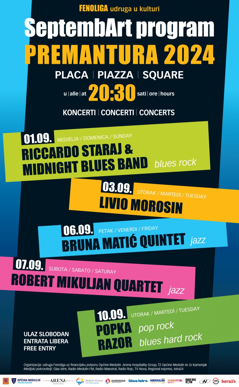 „Fenoliga udruga u kulturi“, koja obilježava 15 g. formalnog djelovanja, u rujnu 2024. godine u sklopu svojeg tradicionalnog projekta „SeptembArt” organizirati će koncertni program na placi u Premanturi. U nedjelju vas očekuje Livio Morosin, jedan od najutjecajnijih, najkarizmatičnijih i višestruko nagrađivanih hrvatskih glazbenika te autor mnogih pjesama koje su promijenile tok hrvatske glazbene povijesti.
