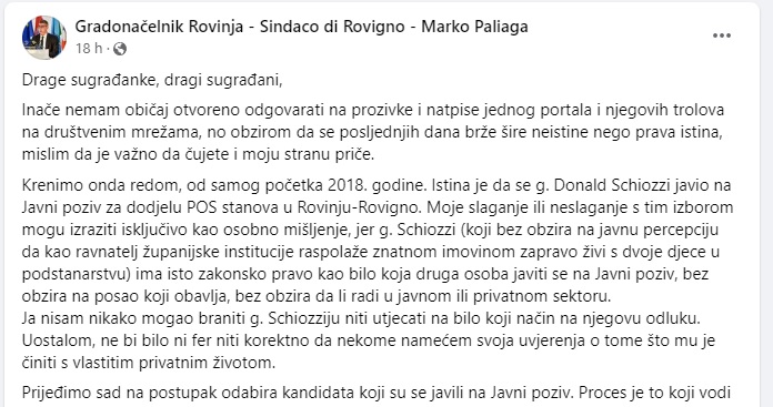 Podsjetimo, gradsko Povjerenstvo je još 2018. godine imenovao gradonačelnik Rovinja Marko Paliaga inače kum ravnatelja Schiozzija. U svom istupu na Facebooku Paliaga se brzinski pokušao odreći svake vrste odgovornosti, te je za kuma izjavio kako "g. Schiozzi koji bez obzira na javnu percepciju da kao ravnatelj županijske institucije raspolaže znatnom imovinom zapravo živi s dvoje djece u podstanarstvu" ovu činjenicu gradonačelnik je znao, a ostala saznanja koja ne bi išla u prilog ostvarivanju prava na POS stan tvrdi da nije znao.