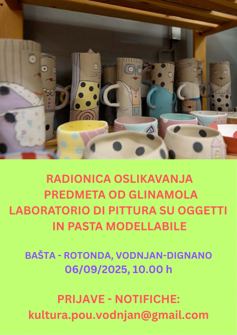 Treća ovogodišnja radionica, na rasporedu u subotu, 6. rujna, s početkom u 10.00h, održat će se u BAŠTI u Vodnjanu. Na radionici će se akrilom i kistovima oslikavati predmeti od glinamola koje su polaznici izradili na prošloj radionici. Radove treba ponijeti sa sobom.