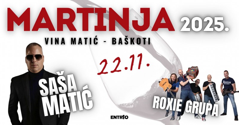 U Baškotima kod Višnjana, u subotu 22. studenog, na trećoj večeri Martinja kod Vina Matić nastupiti će miljenik publike Saša Matić. Publika će moći slušat Sašine hitove Kralj izgubljenih stvari, Nađi novu ljubav, Poklonite mi nju za rođendan, Idemo anđele i brojne druge, a premijerno će Saša izvesti i nove pjesme. Ulaznice se mogu kupiti preko sustava Entrio i na ulazu na dan koncerta.