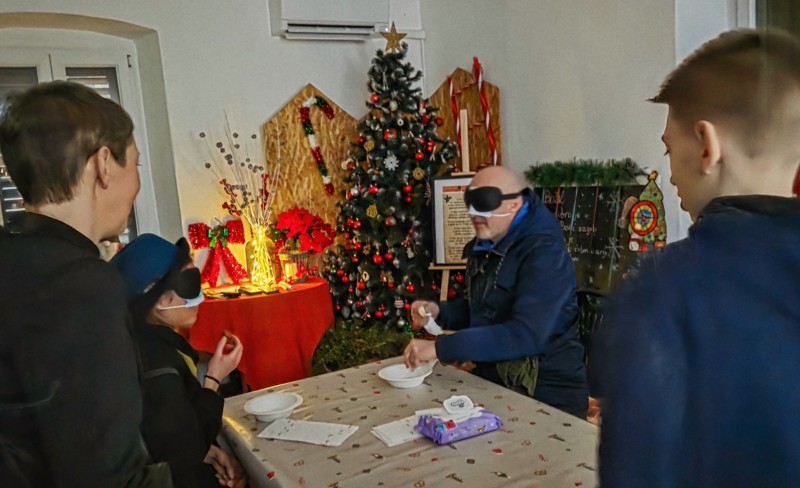 U trećoj se prostoriji održala još jedna zanimljiva, doživljajna aktivnost – prava „večera u škuren“. Volonteri su kroz ovo iskustvo vodili sve zainteresirane pojedinačno, na način da su s povezom na očima i u potpunom mraku, posjetitelji za stolom degustirali slana i slatka jela, te mirisali raznovrsno začinsko bilje, pogađajući što dodiruju, mirišu i jedu. Ova je aktivnost oduševila najmlađe posjetitelje koji su se s roditeljima natjecali u pogađanju mirisa i okusa.