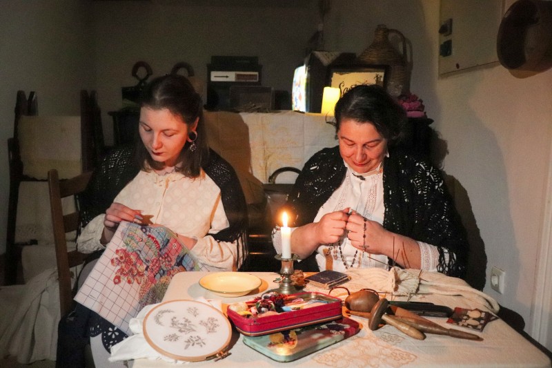 Kako se u prošlosti provodilo vrijeme za dugih zimskih večeri, dok još nije bilo električne energije, rasvjete, televizije, mobitela, interneta, pokazali su volonteri u ulogama ribara koji plete mreže, prijatelja koji igraju karte za stolom u kužini, majke koja obavlja kućanske poslove uz djecu koja pišu školsku zadaću te oca koji za svojim radnim stolom piše na starinskoj pisačoj mašini. Odjeveni u mušku i žensku narodnu nošnju, voditelji su posjetiteljima omogućili interaktivan, zabavan, ležeran i šaljiv razgled u kojem su oživjeli predmeti zbirke koju čuva centar Šantadur. U drugoj prostoriji iznimno je zanimljiv bio prikaz o posebnoj temi - koredu i doti kakvu su i u ne tako davnoj prošlosti medulinske djevojke pripremale i unosile u brak kao svoj doprinos novoj obitelji. Živopisna priča, upotpunjena pravim rukotvorinama i jedinstvenim sačuvanim predmetima iz obiteljske zbirke, stigla je u Šantadur iz poznate medulinske konobe „Mižerija“, a ova je posebna „štorija uz šteriku“ ispričana na medulinskom dijalektu, obogatila program „Šantadurove večeri u škuren“.
