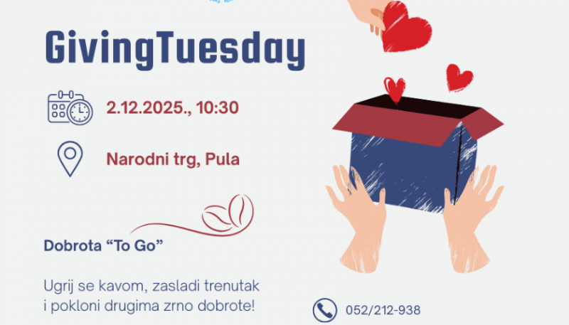 Zaklada Istra – Fondazione Istria i ove se godine uključuje u globalnu inicijativu GivingTuesday, svjetski dan posvećen darivanju, solidarnosti i širenju dobrote. U okviru ovog međunarodnog pokreta organizira se posebno događanje pod nazivom Dobrota “To Go”.