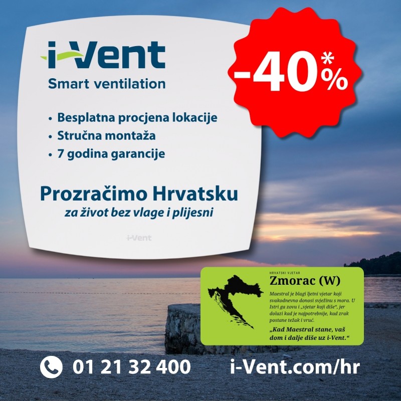 I-VENT rekuperacija dolazi s čak 7 godina garancije, a sada i uz 40% popusta. Iskoristite ovu akciju i osigurajte svom domu trajno rješenje protiv kondenzacije, vlage i plijesni.