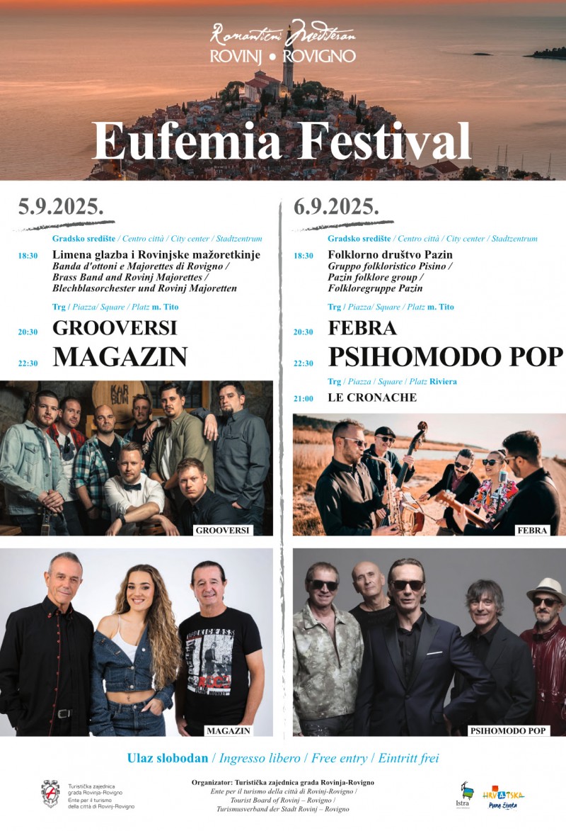 Ovog petka i subote u Rovinju vas očekuje Eufemija Festival. U petak vas očekuje Limena glazba i Rovinjske mažoretkinje, Grooversi i Magazin. U subotu je na rasporedu Folklorno društvo Pazin, Febra, Le Cronache i Psihomodo Pop. U nastavku pogledajte detaljni program festivala: