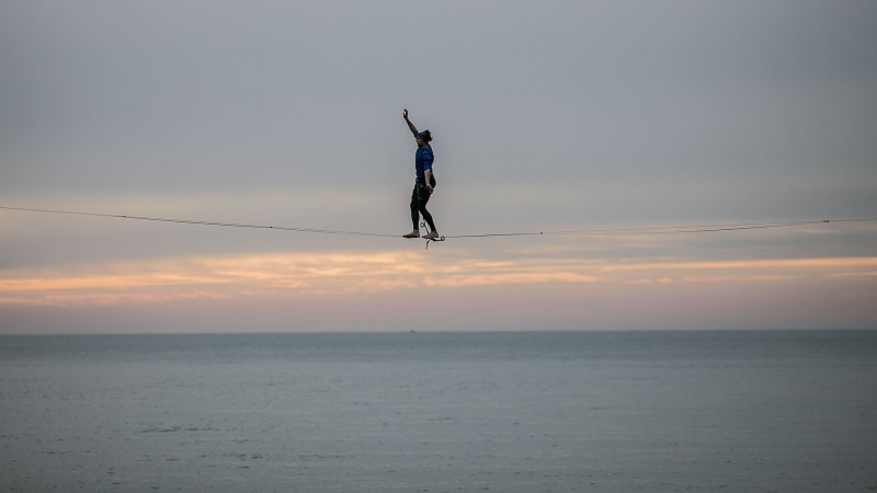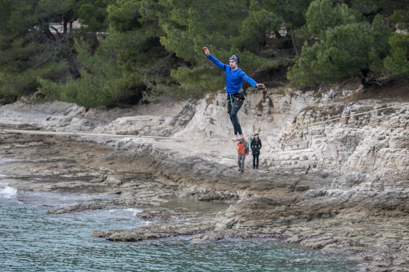 Slacklining je trening dinamičke ravnoteže. Pojam slackline proizlazi iz engleskog jezika, sastavljen je iz dvije riječi „slack“ što znači „nenapet ili labav“ i „line“ što znači „linija, crta ili konopac“. Za aktivnost slacklininga koristi se nategnuta traka ili slackline koja je učvršćena između dva hvatišta, širine od 2,5 do 5 cm, dok dužina trake nije ograničena. Traka koja se koristi može biti od najlona ili poliestera. Za razliku od hodanja po konopu, kod slacklininga koristi se dinamički rastezajuća traka koja ima značajke dugačkog trampolina. Glavni cilj je pokušati održavati ravnotežu na traci u raznim oblicima kretanja; odnosno pokušati stajati, hodati, raditi različite elemente, figure. (rex/foto Manuel Angelini)
