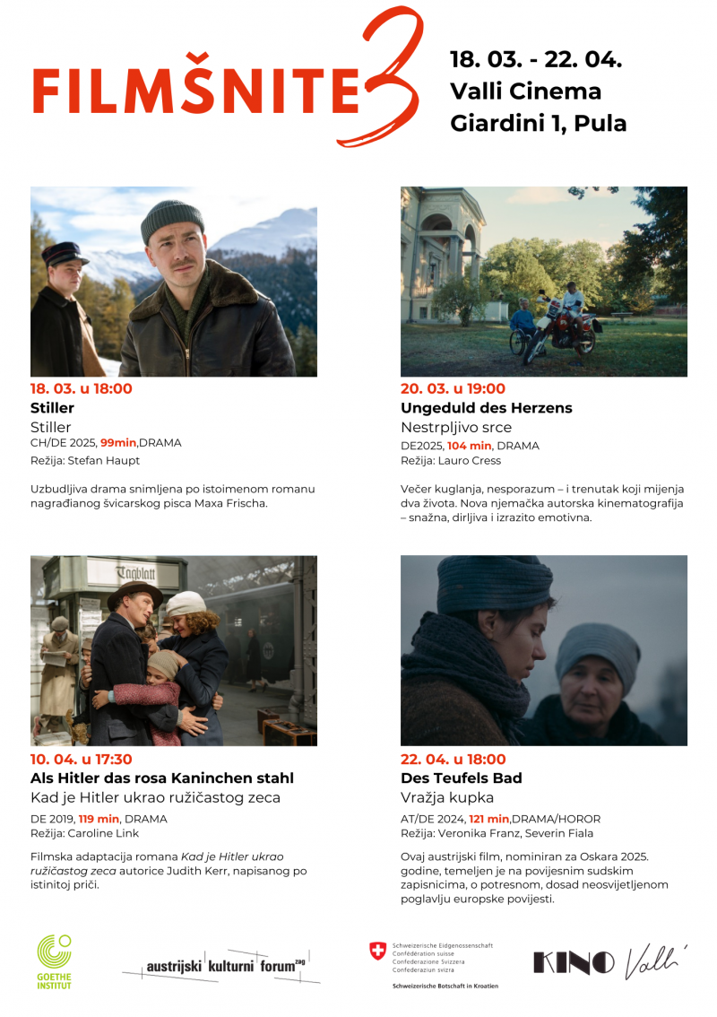 Tijekom ožujka i travnja pulsku publiku očekuju neki od najcjenjenijih suvremenih filmova iz Austrije, Njemačke i Švicarske, a ciklus filmova Filmšnite 3 kreće ove srijede, 18. ožujka u 18:00 sati projekcijom švicarskog filma „Stiller“, snimljenog prema istoimenom romanu Maxa Frischa. U protoku otvorenja sudjelovat će počasna konzulica Konzulata Švicarske Konfederacije u Republici Hrvatskoj, gđa. Draženka Moll.