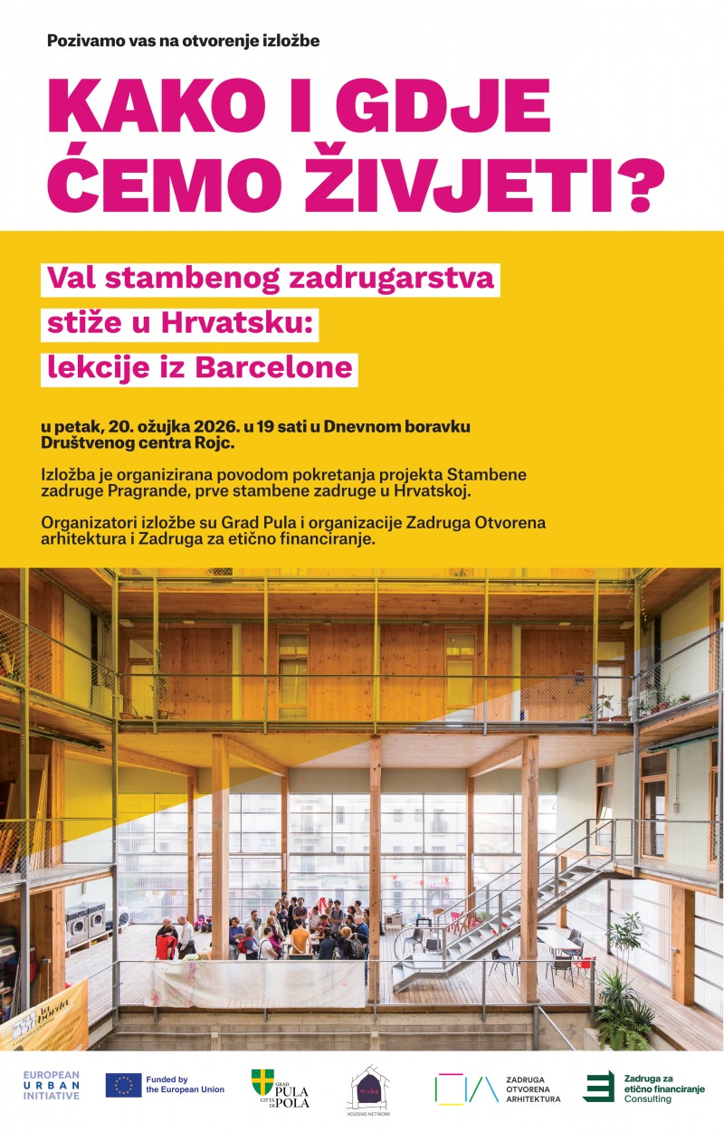 Pozivamo vas na otvorenje izložbe „Kako i gdje ćemo živjeti? – Val stambenog zadrugarstva stiže u Hrvatsku: lekcije iz Barcelone“, koje će se održati u petak, 20. ožujka 2026. u 19 sati, u Dnevnom boravku Društvenog centra Rojc. Izložba je organizirana povodom pokretanja projekta Stambene zadruge Pragrande, prve stambene zadruge u Hrvatskoj. Na jednom mjestu okupljen je materijal koji posjetiteljima približava model stambenog zadrugarstva.