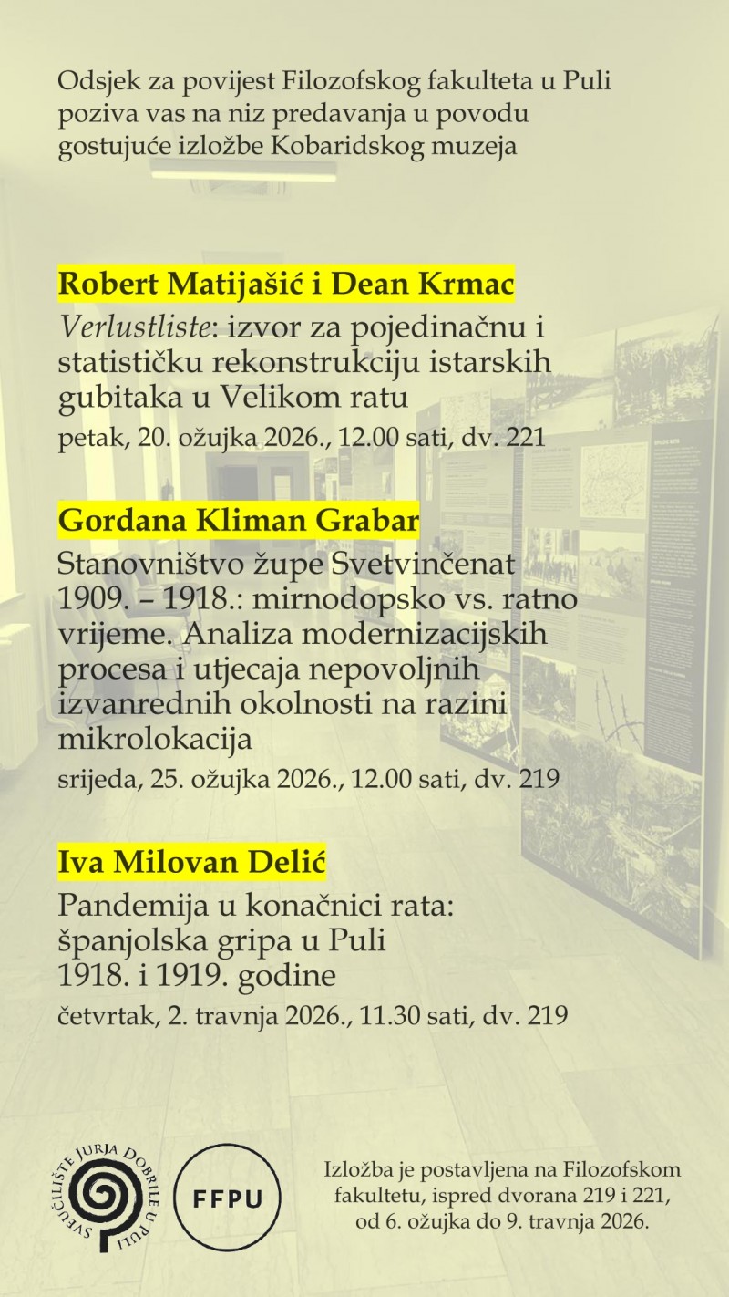 Odsjek za povijest Filozofskog fakulteta u Puli poziva vas na niz predavanja u povodu gostujuće izložbe Kobaridskog muzeja. Prvi od njih je predavanje Roberta Matijašića i Deana Krmca.