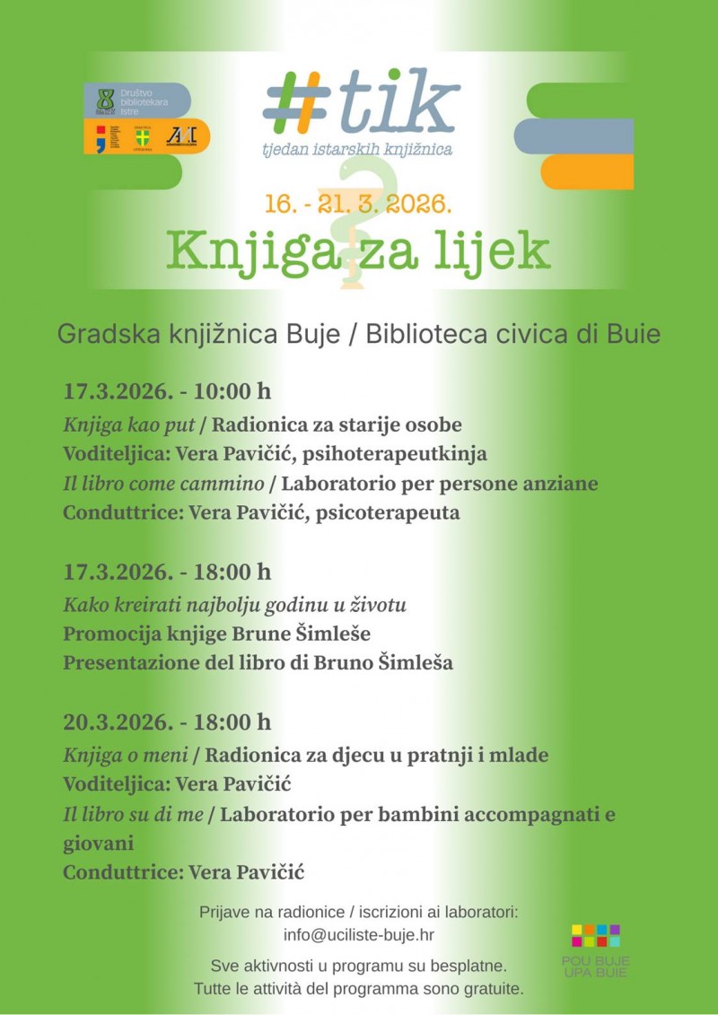 Ovogodišnji program Tjedna istarskih knjižnica posvećen je mentalnom zdravlju i odvijat će se pod sloganom „Knjiga za lijek“. Stoljetna uloga knjiga u procesu zaštite, liječenja i ozdravljenja od bolesti, a i važna uloga koju knjižnice imaju u pogledu razvoja biblioterapije i programa usmjerenog čitanja bit će u središtu projekta, a uključivat će programe za javnost i one namijenjene knjižničarima.