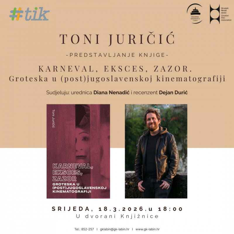 U srijedu 18. ožujka u 18 sati, u organizaciji Gradske knjižnice Labin i Hrvatskog filmskog saveza, održat će se predstavljanje knjige „KARNEVAL, EKSCES, ZAZOR. Groteska u (post)jugoslavenskoj kinematografiji“ našeg sugrađanina Tonija Juričića.