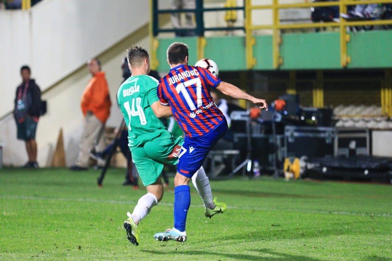Hajduk je bolje otvorio utakmicu i već u 1. minuti Jradi s vrha peterca puca glavom, ali spašava Čondrić odličnom intervencijom. U prvih pola sata, gledali smo dosta rastrganu igru, nadmoćniji Hajduk, a domaći su prijetili dalekometnom paljbom Bušnje, Gržana i Grujevića. U 34. minuti Hajduk je poveo, a strijelac je bio Mijo Caktaš sjajnim eurogolom. Akcija je krenula gužvom u šesnaestercu Hajduka, ali lopta dolazi do jakoliša koji je prošao cijeli teren, dodao Caktašu, koji je naciljao i pogodio za 0:1.