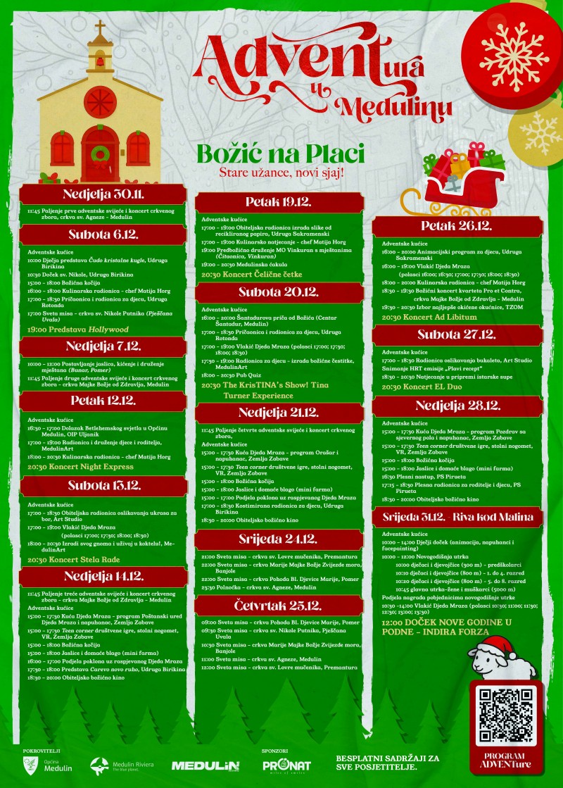 Ovogodišnja ADVENTura već se istaknula kao jedno od najintimnijih blagdanskih zbivanja u Istri. Medulin je i ove zime mjesto susreta: mještana, djece, turista i svih koji vole opuštenu, toplu i obiteljsku adventsku atmosferu. Od mini farme i radionica do svjetlucavih ukrasa i tradicionalne gastro ponude - sve je spremno za blagdane kakve priželjkuje cijela zajednica.