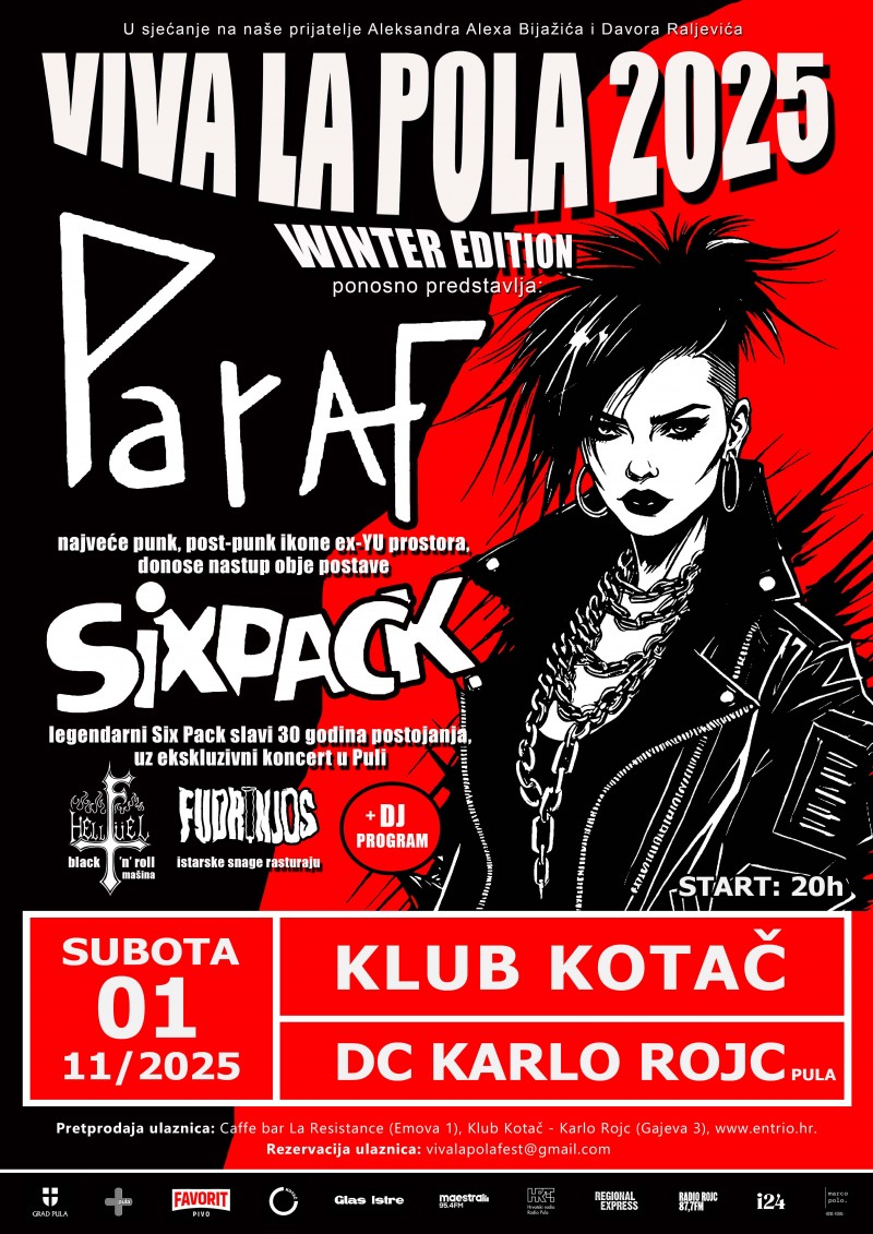 Najveće ikone punka, post-punka na ovim prostorima stižu u Pulu! Započevši 1976., Paraf su bili glavni okidač za stvaranje novog zvuka u ex-YU, a ujedno su bili i jedan od prvih punk bendova u Europi, stvorivši revoluciju koja se zakovitlala do neslućenih razmjera. Donijevši novi zvuk, stvorivši generacijske himne kao što su „Moj život je novi val“, „Narodna pjesma“ i dr. uz album prvijenac „A dan je tako lijepo počeo...“ i izvorni punk zvuk, prvi dio osamdesetih za Paraf donosi nove iskorake u zvuku, nadogradivši se na post-punk, izdavši dva antologijska albuma „Izleti“ i „Zastave“. Paraf pokazuju kako bunt živi zauvijek i kako se i u današnjem vremenu može vrhunski i beskompromisno prašiti. Sukladno navedenom, sljedeće godine, Paraf slave nevjerojatni jubilej – 50. godišnjicu nastanka benda!, tako da već 01.11. možete uživati u proslavi tog značajnog vremenskog trenutka. Također, uskoro će se u izdanju “Dallas Records” pojaviti i potpuno novi album s jedanaest numera. Album nosi znakovit naziv - “PARAF”, i bit će objavljen istovremeno na svim digitalnim platformama kao i na vinilu. Na “Viva La Polu!”, Paraf stižu u punom sastavu - Pavica Čabrijan, Valter Kocijančic, Zdrave Čabrijan, Raul Varljen, Iva Močibob, Deni Šesnic, Bobo Grujičić i Vava. Osim predstavljanja novog albuma, u Kotaču ćete moći uživati i u svim legendarnim bezvremenskim numerama grupe Paraf. Strašno se veselimo susretu, 1.11.!