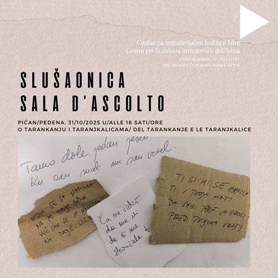 Pozivamo vas u Centar za nematerijalnu kulturu u Pićnu, u petak 31.10.2025. u 18 sati, na Slušaonicu - radionicu na kojoj ćete naučiti kako nastaju, kako se mijenjaju i prenose tradicijski tekstovi u prvoj tradiciji (podstil tarankanje). Radionicu će voditi Noel Šuran.