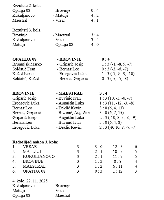 U subotu su stolnotenisači Brovinja odradili dvostruki ligaški program. Najprije su u Koromačnu odradili utakmicu 3. kola protiv Maestrala, a zatim su u Matuljima odigrali odgođeni susret 2. kola protiv Opatije 08.
