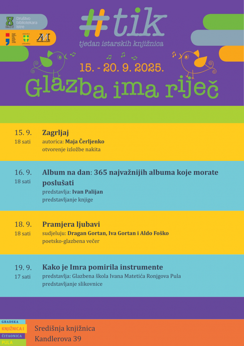 Ovogodišnji Tjedan istarskih knjižnica - TIK, manifestacija u organizaciji Društva bibliotekara Istre, održat će se od 15. do 20. rujna 2025. godine pod sloganom Glazba ima riječ.
