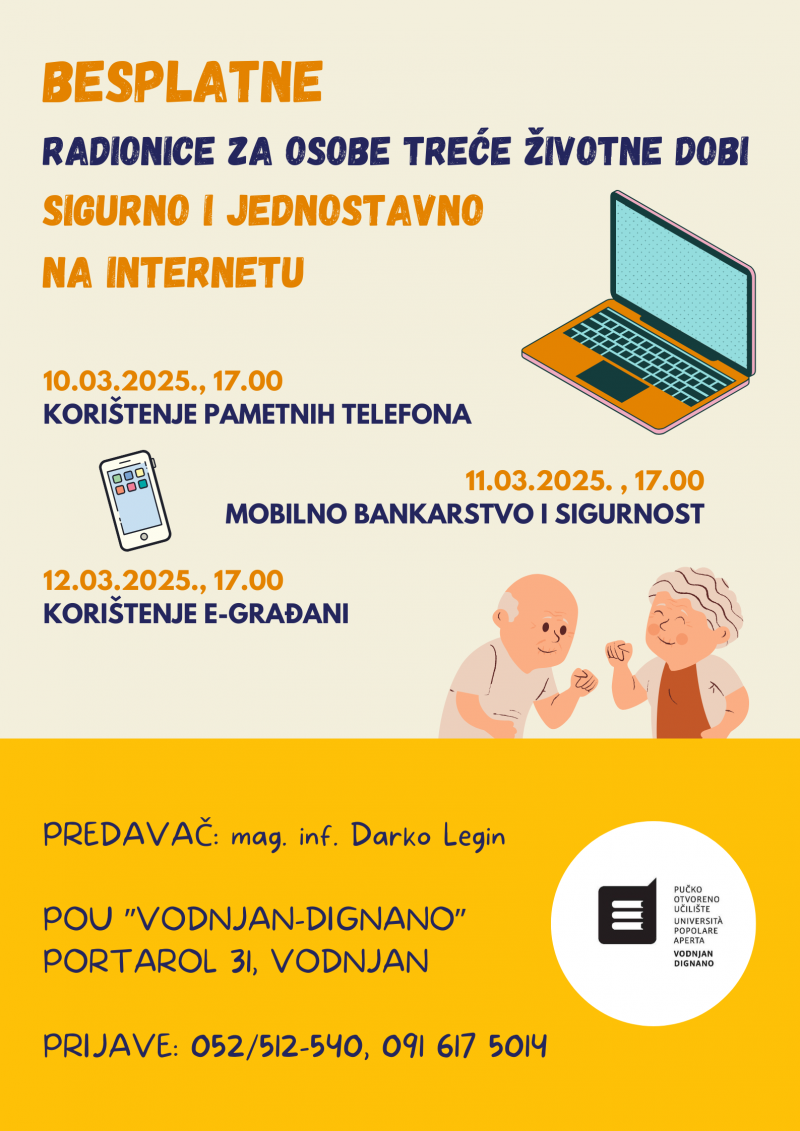 Pučko otvoreno učilište “Vodnjan-Dignano” organizira besplatne radionice za osobe treće životne dobi „Sigurno i jednostavno na internetu“. Radionice će se održati 10., 11. i 12. ožujka u 17.00 sati u prostorima Učilišta (Portarol 31, Vodnjan), a vodit će ih mag. inf. Darko Legin.