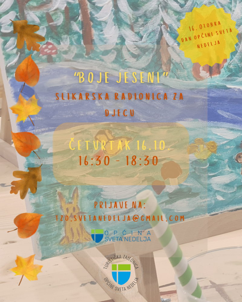 Povodom obilježavanja Dana Općine Sveta Nedelja, u četvrtak, 16. listopada 2025. godine, s početkom u 16:30 sati, u prostorijama Osnovne škole Vitomir Širola Pajo održat će se slikarska radionica za djecu pod nazivom „Boje jeseni”. Radionicu će voditi likovna pedagoginja i slikarica Silvia Golja, koja će mališane voditi kroz stvaralački proces oslikavanja šarenih jesenskih pejzaža, potičući njihovu maštu, kreativnost i ljubav prema umjetnosti.