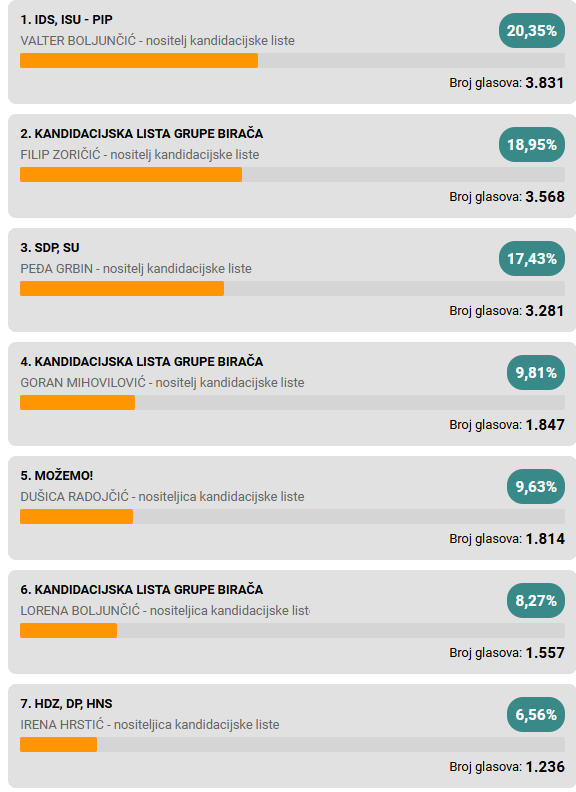 Objavljeni su rezultati sa 100% izbornih mjesta za izbor članova Gradskog vijeća u Puli. Brojke pokazuju tijesan rezultat i veliku političku raznolikost i rascjepkanost biračke volje. U Puli je izlaznost bila nešto iznad 40%, a dosadašnji gradonačelnik dobio je podršku samo 18 % birača za svoju listu u Gradskom vijeću. U drugi krug za gradonačelnika ušli su Filip Zoričić i Peđa Grbin, a u gradskom vijeću nijedna lista nije osvojila dovoljnu podršku za samostalno formiranje većine, što otvara prostor za složene koalicijske pregovore u danima koji slijede.
