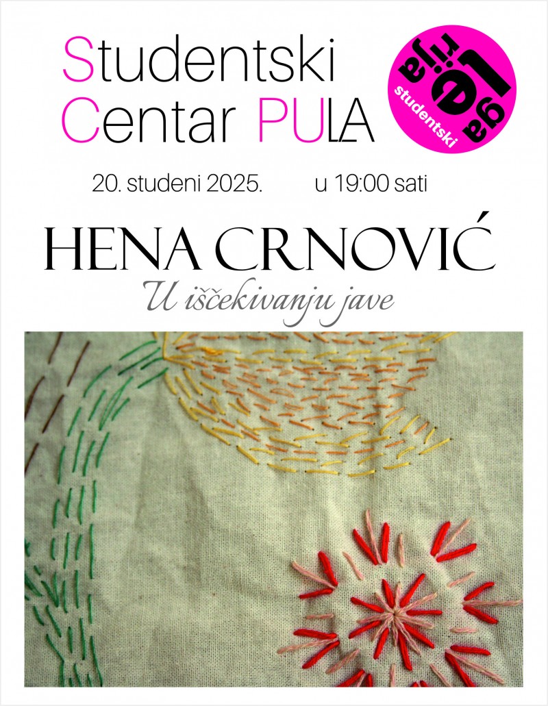 U galeriji Studentski u Puli (Preradovićeva 9) u četvrtak, 20. studenog, u 19 sati bit će otvorena izložba "U iščekivanju jave" mlade pulske umjetnice Hene Crnović. Izložba predstavlja niz radova nastalih istraživanjem odnosa svjesnog i nesvjesnog, pri čemu autorica kombinira intuitivne poteze i promišljene, strukturirane elemente.