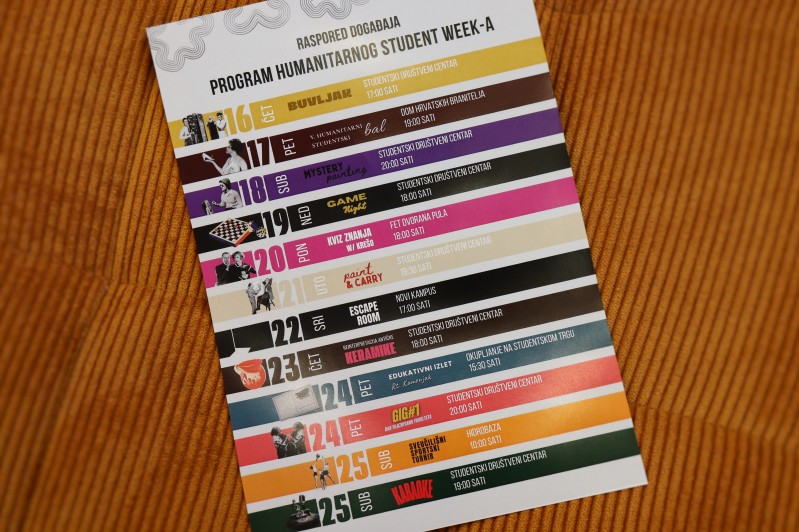 Sljedećih dana program donosi niz zanimljivih događanja - od Humanitarnog studentskog bala u Domu hrvatskih branitelja, preko kreativnih radionica poput “Mystery Paintinga” i “Paint&Carry” večeri, pa sve do društvenih večeri uz board igre.