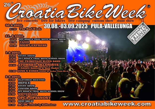 Od ostalih bendova koji će nastupiti na ovogodišnjem Croatia Bike Weeku istaknut ćemo finaliste hrvatskog Supertalenta 2022 - The Bad Week te poznatu Opću Opasnost, kojoj nije prvi put da nastupa na ovome festivalu. Po prvi puta na pulskoj Vallelungi održat će se prezentacija Off Road & Trial škole koju vodi Alex Vencl, dvostruki prvak Hrvatske u trialu pa će se uz samu prezentaciju škole na licu mjesta moći dogovoriti i individualne edukacije. Stunt show će izvesti poznati Dejan Špoljar zajedno sa svojim timom.