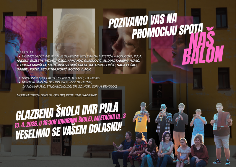 Učenici Glazbena škola Ivana Matetića-Ronjgova Pula predstavit će svoj autorski projekt 'Naš balon' u ponedjeljak, 13. travnja 2026. godine, u sklopu obilježavanja Dana škole. Promocija videospota održat će se u dvorani škole s početkom u 16:30 sati.