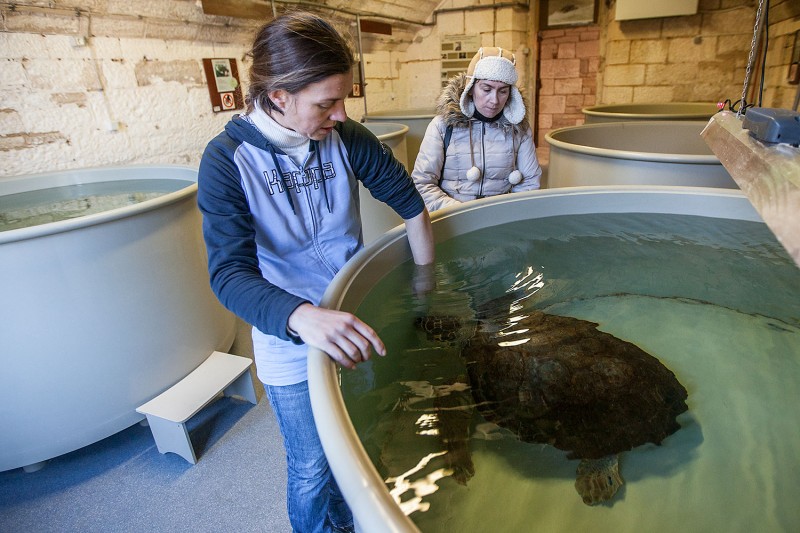 Ove kornjače su u Aquarium nažalost stigle zbog ozljeda, Grande ima ozlijeđenu glavu i napola je slijep a pretpostavlja se da je zahvaćen propelerom. Lunga je u dosta lošijem stanju, vidi lošije od Grandea i njezina ozljeda glave je vjerojatno nastala namjernim udarcem. Zasad samo pluta.
